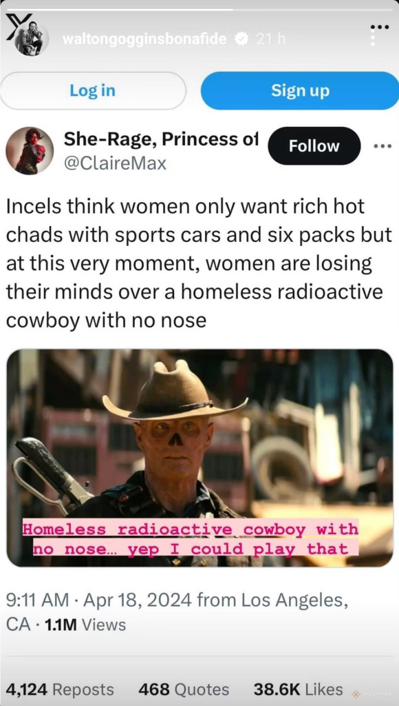 One post on X/Twitter read: “Incels think women only want rich hot chads with sports cars and six packs but at this very moment, women are losing their minds over a homeless radioactive cowboy with no nose.”