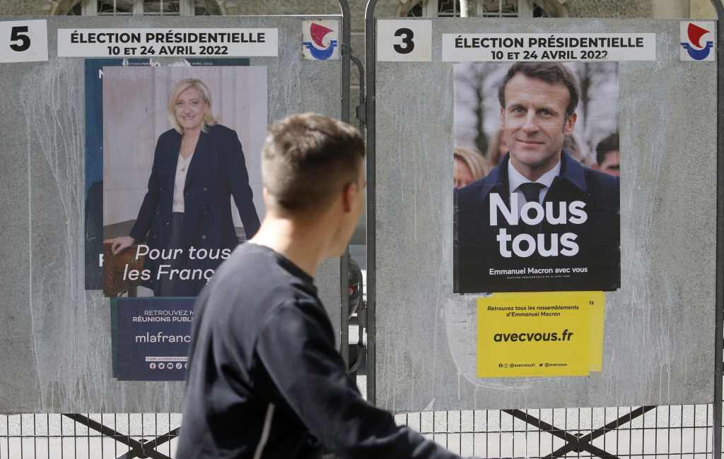A man walks past official campaign posters of Marine Le Pen Emmanuel Macron
