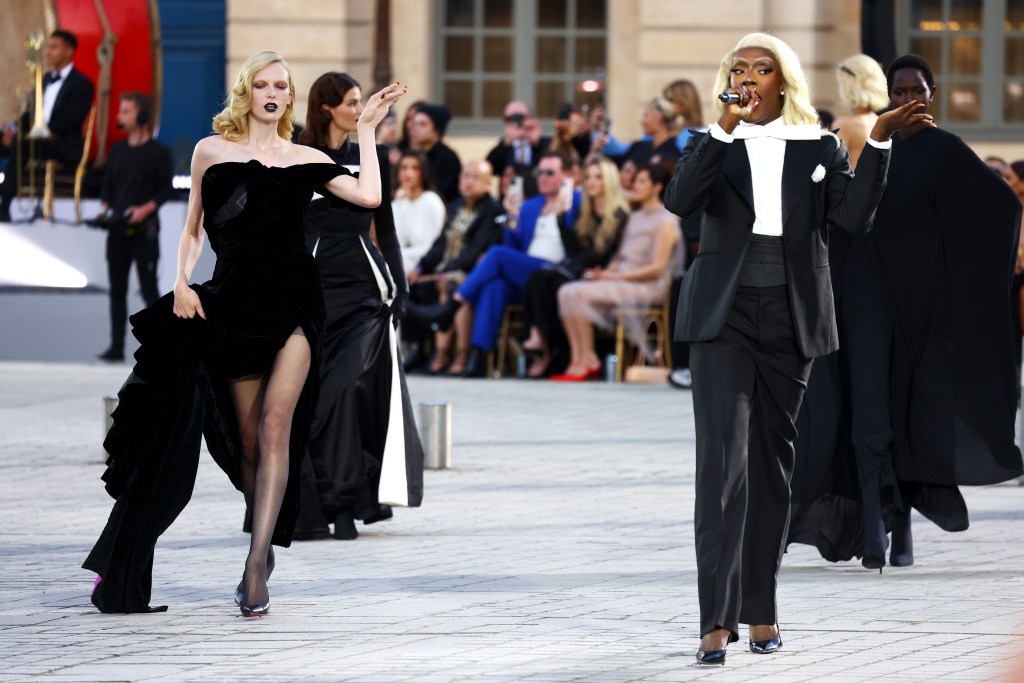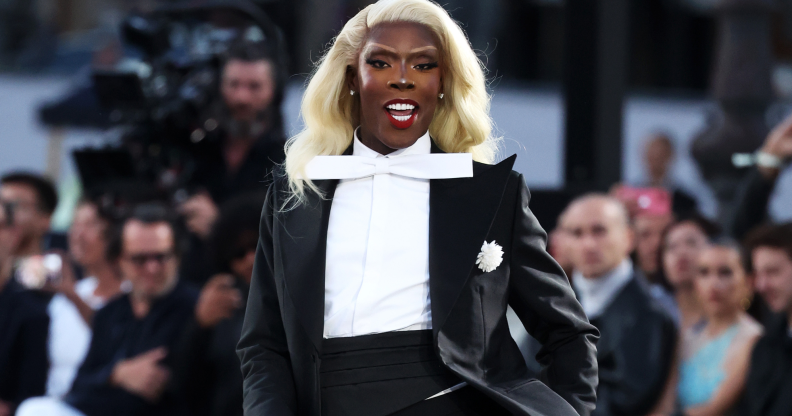 Walking the runway for the Track & Field segment of the show in Nina Ricci, the drag artist addressed attendees via a microphone.