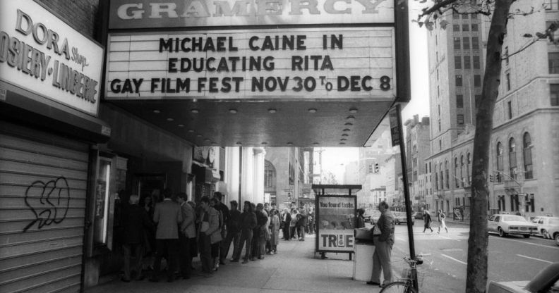 Long lines form under the Grammercy Theater marquee for the Gay Film Festival and Michael Caine starring in “Educating Rita” on East 23rd Street in the Grammercy Park neighborhood on December 3, 1983 in New York City. (Getty)