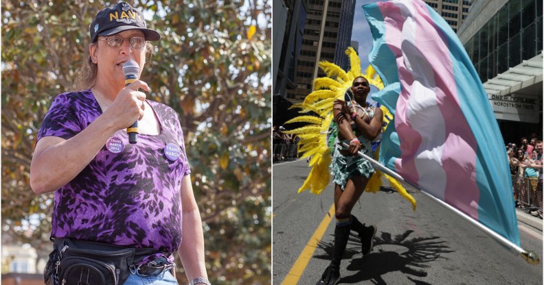 The trans pride flag was created by Monica Helms (L) in 1999 and first flown at a pride parade in 2000. (Getty/Wikimedia Commons)