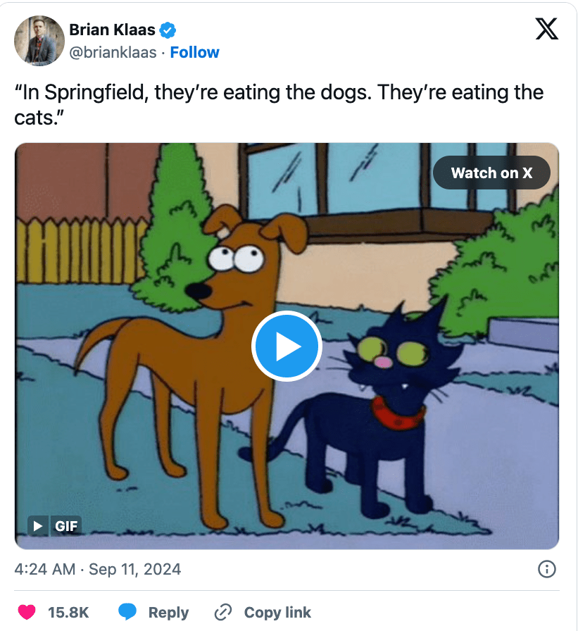 “In Springfield, they’re eating the dogs. They’re eating the cats,” the post reads.