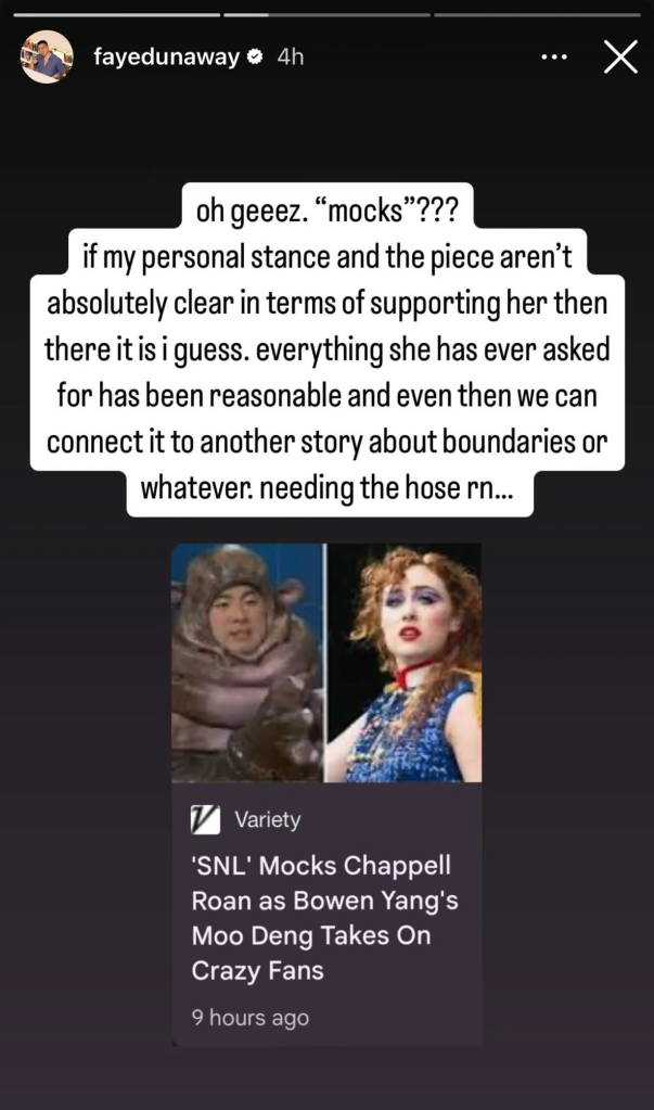 Yang, however, who recently spoke to Chappell Roan for Interview Magazine, has rejected the claim, taking to his Instagram Story to spell it out for fans of the “Pink Pony Club” songstress.