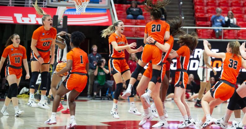 Members of the Princeton Tigers react after beating the NC State Wolfpack during the second half of the first round of the NCAA Womens Basketball Tournament at the John M Hungsman Center March 11, 2023 (Getty)