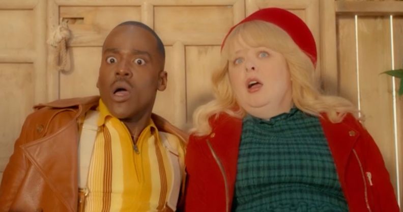 Ncuti Gatwa and Nicola Coughlan in Doctor Who's Christmas special "Joy To The World". (BBC)