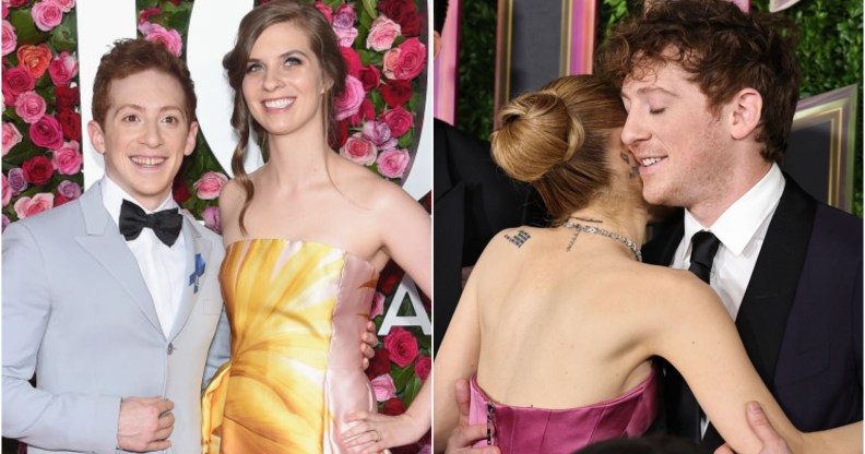 (L) Ethan Slater pictured with Lilly Jay in 2018, (R) Ariana Grande hugs Ethan Slater at the New York premiere of Wicked in November 2024 (Getty)