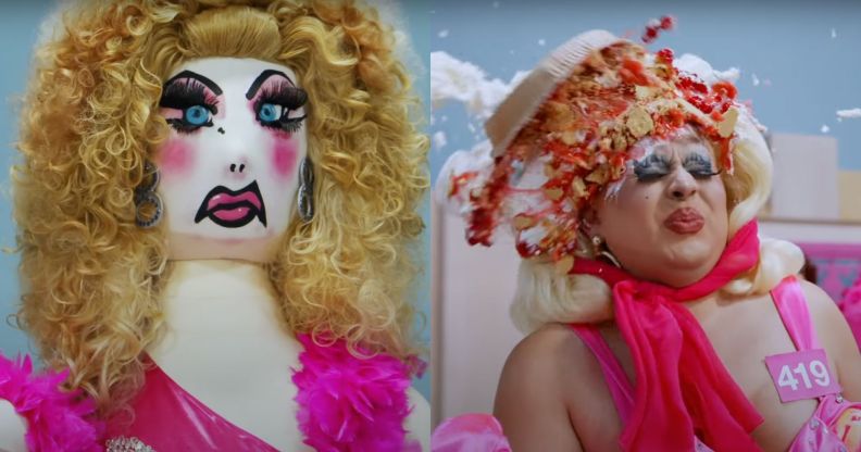 A host of Drag Race favourites including winners Angeria Paris VanMichaels, Trinity The Tuck and Kylie Sonique Love, plus fan favourites Jaymes Mansfield and Kerri Colby, end up getting pied and eliminated from the game.