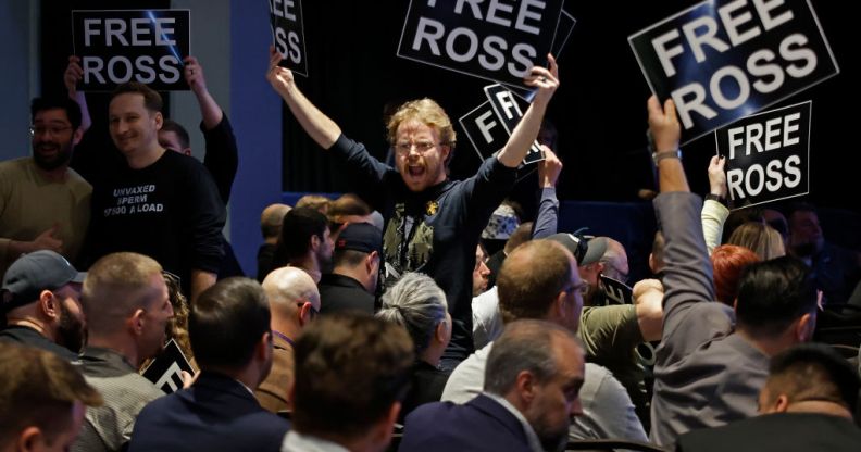 Members of the Libertarian Party stand in chairs while chanting and demanding the release of Ross Ulbricht during the party's national convention at the Washington Hilton on May 25, 2024 in Washington, DC. (Getty)