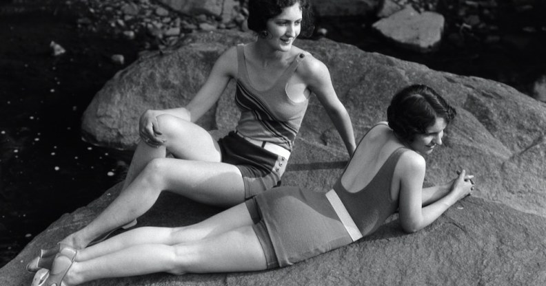 Two women relaxing on a rock in the 1920s. (Getty)
