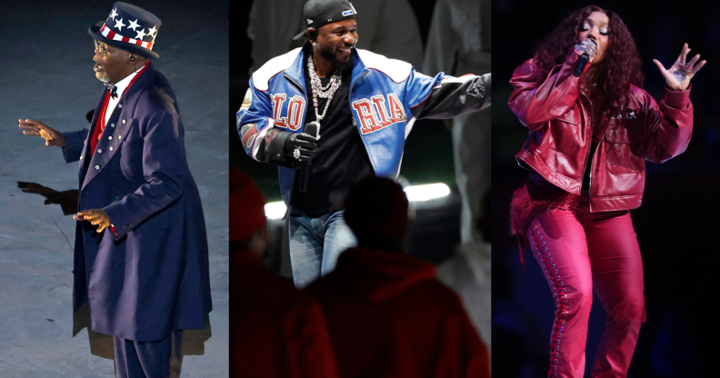 Samuel L. Jackson, Kendrick Lamar and SZA performed at the Super Bowl halftime show. (Getty Images)