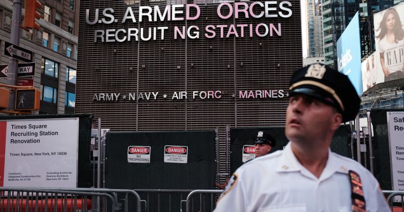A police officer stands guard as dozens of protesters gather in Times Square near a military recruitment center to show their anger at President Donald Trump’s decision to reinstate a ban on transgender individuals from serving in the military. (Getty)