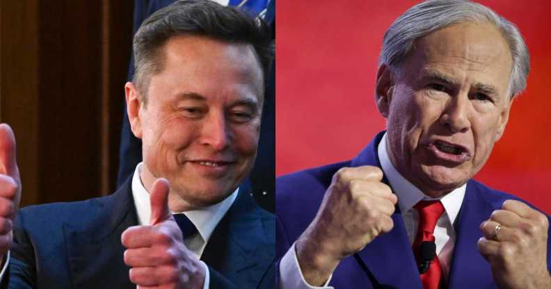 Elon Musk (L) and Texas governor Greg Abbott (R) both celebrated the firing over a worker who refused to remove his pronouns from his work email signature. (Ricky Carioti/The Washington Post via Getty Images/Alex Wong/Getty Images)