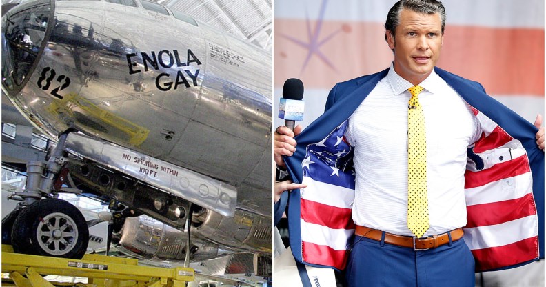 R: New Pentagon chief Pete Hegseth has been criticised after an AP report showed that images of Hiroshima bomber Enola Gay had been earmarked for deletion from the Dept. of Defense website (Getty)