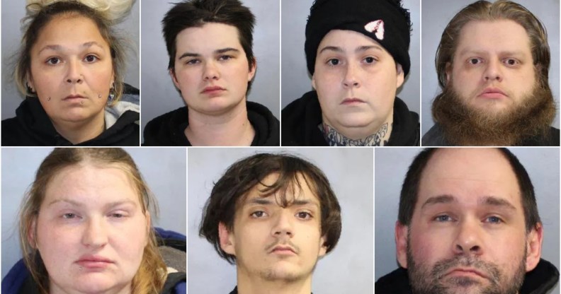 Clockwise, from left: Mugshots of Precious Arzuaga, Emily Motyka, Jennifer Quijano, Patrick Goodwin, Kyle Sage, Thomas Eave, Kimberly Sochia (New York State Police)