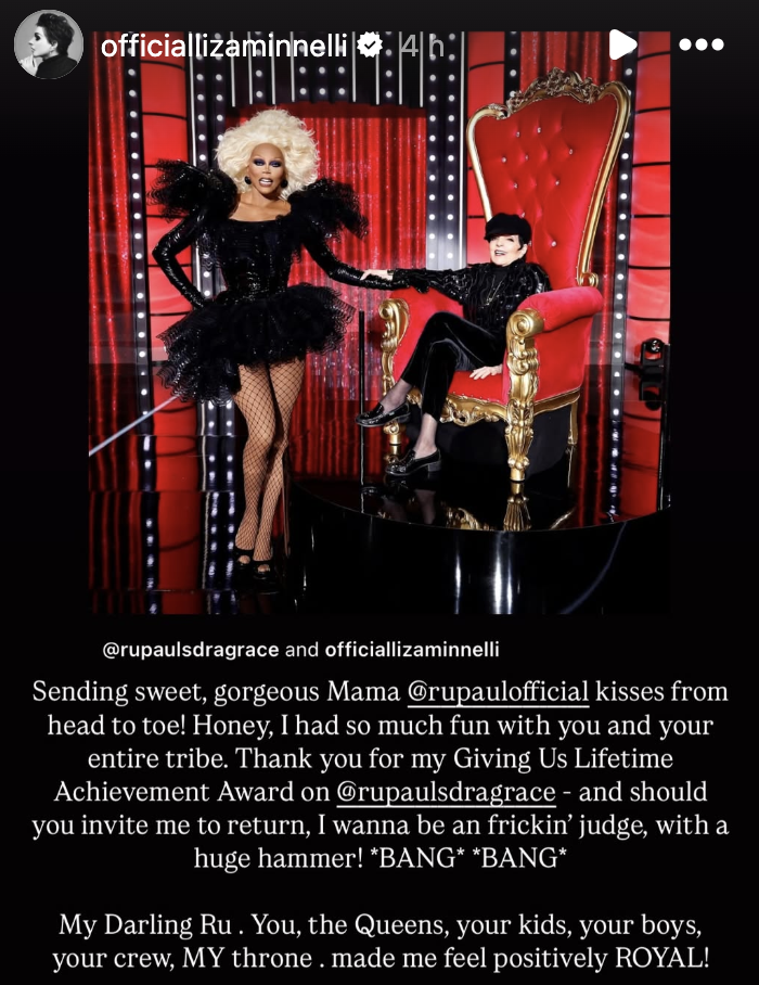 “Sending sweet, gorgeous Mama [RuPaul] kisses from head to toe! Honey, I had so much fun with you and your entire tribe. Thank you for my Giving Us Lifetime Achievement Award on [RuPaul’s Drag Race] – and should you invite me to return, I wanna be a frickin’ judge, with a huge hammer! *BANG* *BANG*,” she wrote.