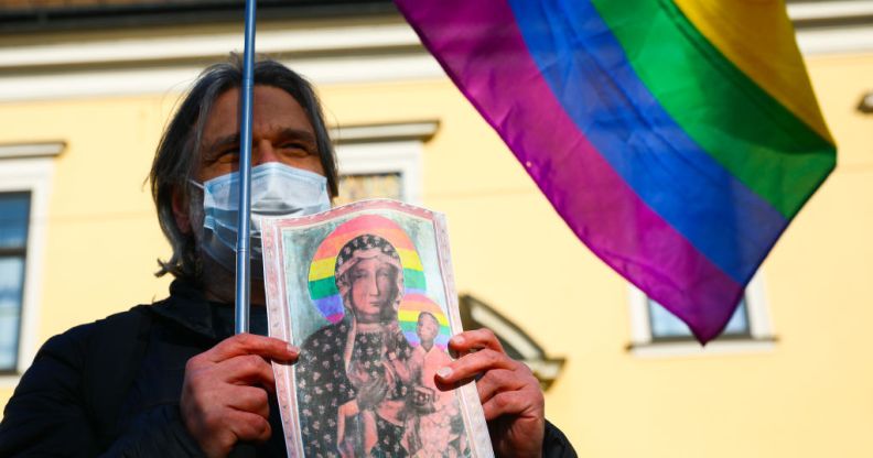 LGBTQ+ activists in Poland demonstrate to support three activists who had been accused of desecration and offending religious feelings for adding the LGBTQ rainbow to images of a revered Roman Catholic icon. (Getty)