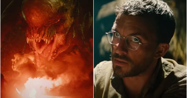 (L) The Distortus Rex, a sort of unholy combination of the Cloverfield Monster and a dinosaur. (R) Jonathan Bailey in his slutty glasses (Universal)