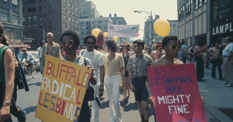 Representatives of the Buffalo Radical Lesbians take part in an LGBTQ+ parade through New York City on Christopher Street Gay Liberation Day 1971. (Getty)