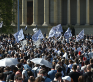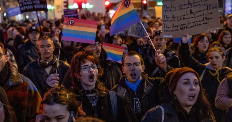 Thousands took to the streets in Hungary to protest its Pride ban. (Janos Kummer/Getty Images)
