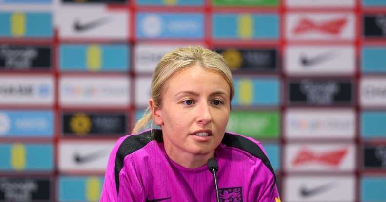 Leah Williamson of England speaks to the media during a press conference at St Georges Park on May 29, 2025 in Burton-upon-Trent, England. (Photo by Molly Darlington/Getty Images)