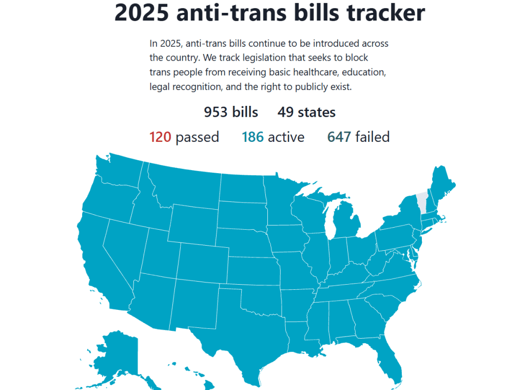While 120 anti-trans bills have passed in 2025 regarding gender-affirming care, education, legal recognition and the right to publicly exist, over five times more anti-trans bills have failed to be introduced in the US.