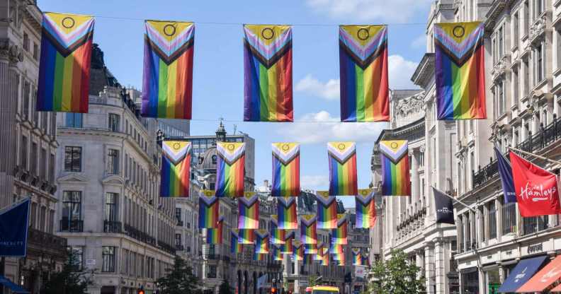 Pride flags seen decorating Regent Street for Pride Month. (Vuk Valcic/SOPA Images/LightRocket via Getty Images)