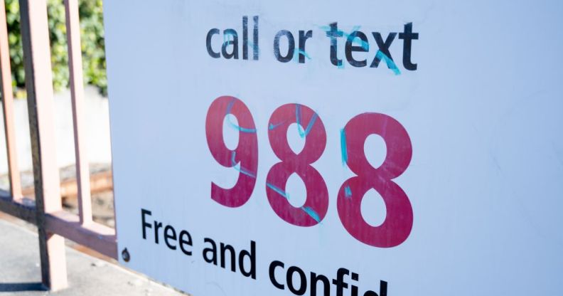 Close-up of a mental health crisis helpline sign reading ‘Call or text 988’ in California (Photo by Smith Collection/Gado/Getty Images)