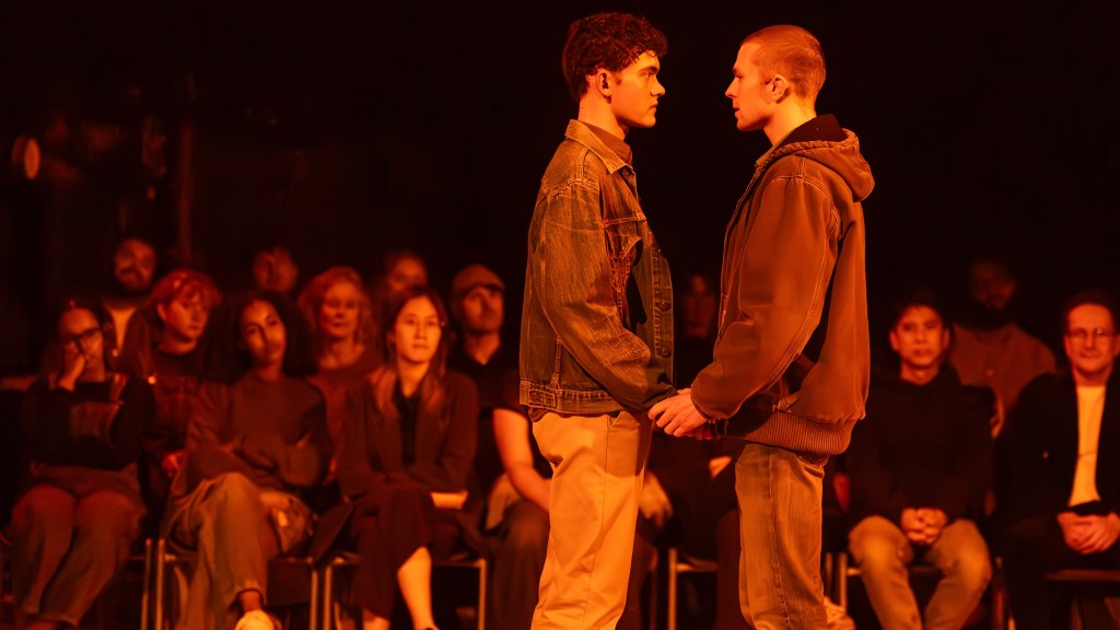 One thing that feels unnecessary here is the staging. The play is set in the round with some audience members sat onstage. Director Jack Serio talks in the programme about using a “stripped-down aesthetic” and “theatrical essentialism,” using what you need and nothing more.