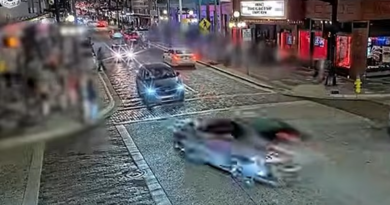One of the cars, which police said Sampson was behind the wheel of, is then seen to break away as the driver loses control, before running through an intersection and hitting more than a dozen people on the bar’s patio.