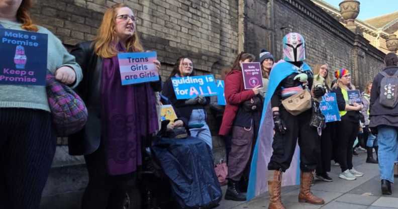 Demonstrators, many which were wearing their Girlguiding uniforms, attended with colourful placards that read: “You taught me to be kind and helpful: I stand with trans girls”, “Guides Slay Transphobia” and “Protect Trans Youth”, amongst other slogans. Badges made especially for the protest, which feature the colours of the trans flag, were also handed out and worn on people’s uniforms.
