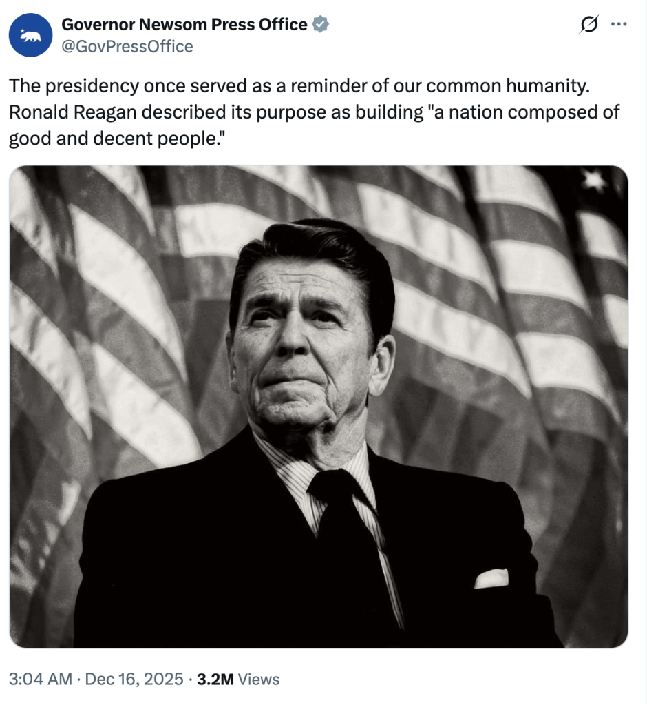 “The presidency once served as a reminder of our common humanity,” Newsom’s press office wrote in post shared across his social media platforms, as a dig against Trump.