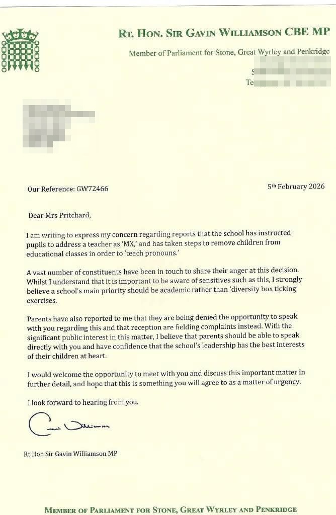 He went on to say he had been contacted by several parents who complained the teacher had asked to be referred to “by the pronouns Mx” and alleged pupils were being punished for misgendering the teacher and removed from lesson to be taught about pronouns.