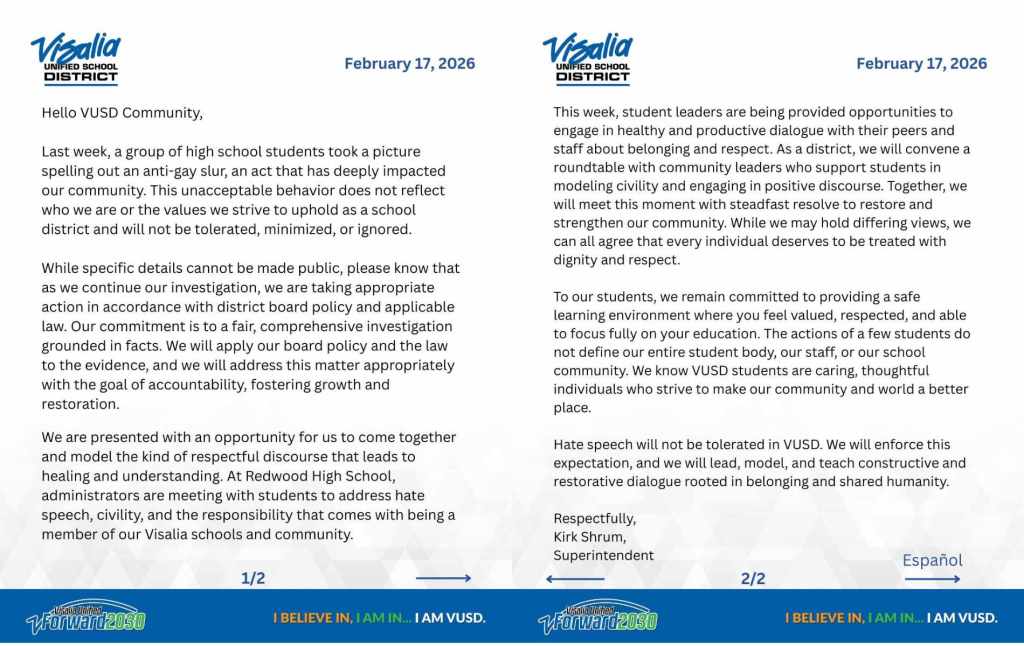 Shrum said the school has been “presented with an opportunity for us to come together and model the kind of respectful discourse that leads to healing and understanding, adding administrators are meeting with students to “address hate speech, civility, and the responsibility that comes with being a member of our Visalia schools and community”.