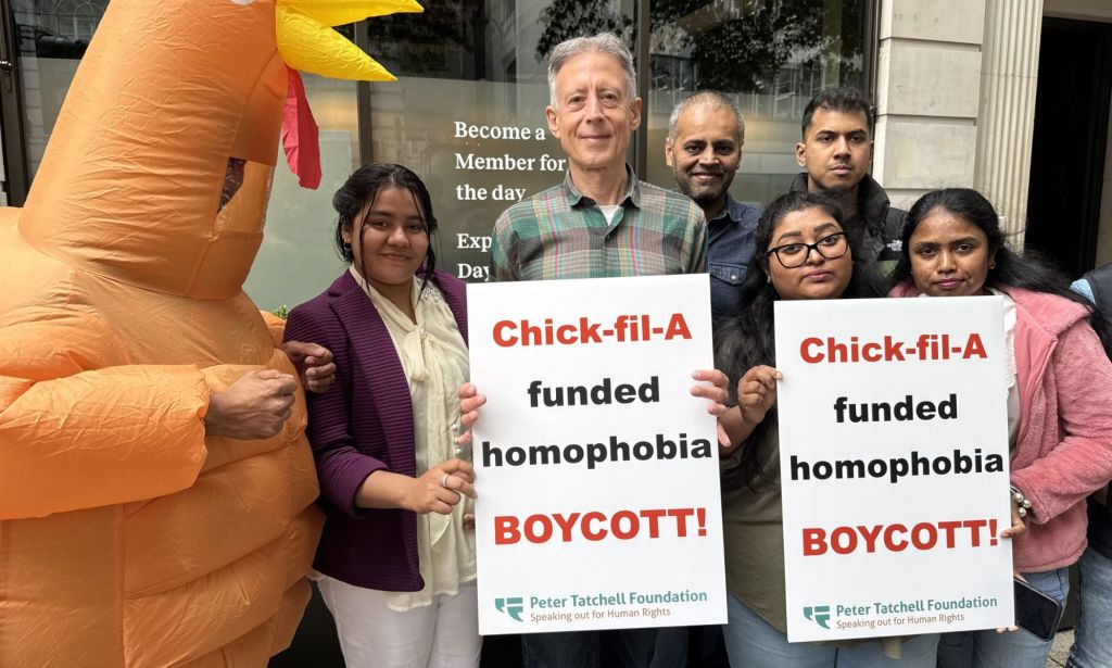 “We have been unable to secure assurances that Chick-fil-A will not in future fund homophobic organisations that campaign against LGBT+ human rights. Every letter and request for a meeting has been ignored,” he said. “Our protest calls on Chick-fil-A to publicly commit to ending all financial support for organisations promoting discrimination. Until we have that commitment, consumers should boycott Chick-fil-A.”