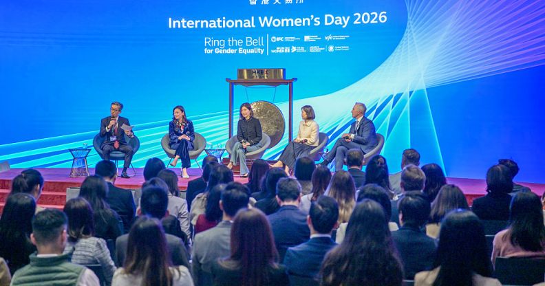 Guests attend the “Ring the Bell for Gender Equality” ceremony at the Hong Kong Exchanges and Clearing Limited (HKEX) Connect Hall on March 6, 2026 in Hong Kong, China. (Photo by Chen Yongnuo/China News Service/VCG via Getty Images)