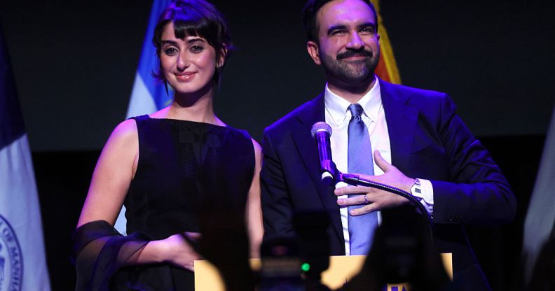 Zohran Mamdani stands with his wife Rama Duwaji (L) after delivering remarks at his election night watch party at the Brooklyn Paramount on November 4, 2025 (Photo by Spencer Platt/Getty Images)
